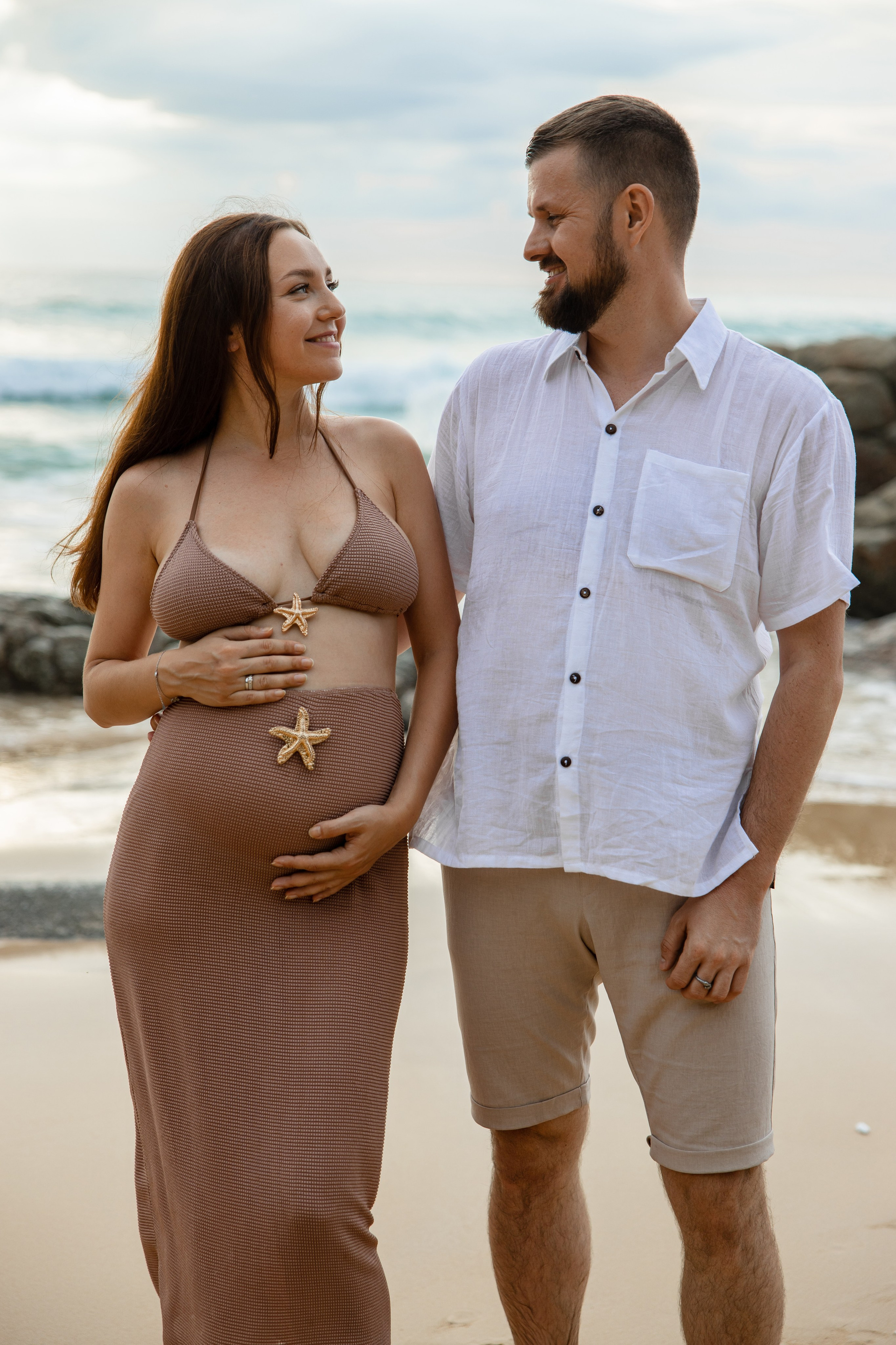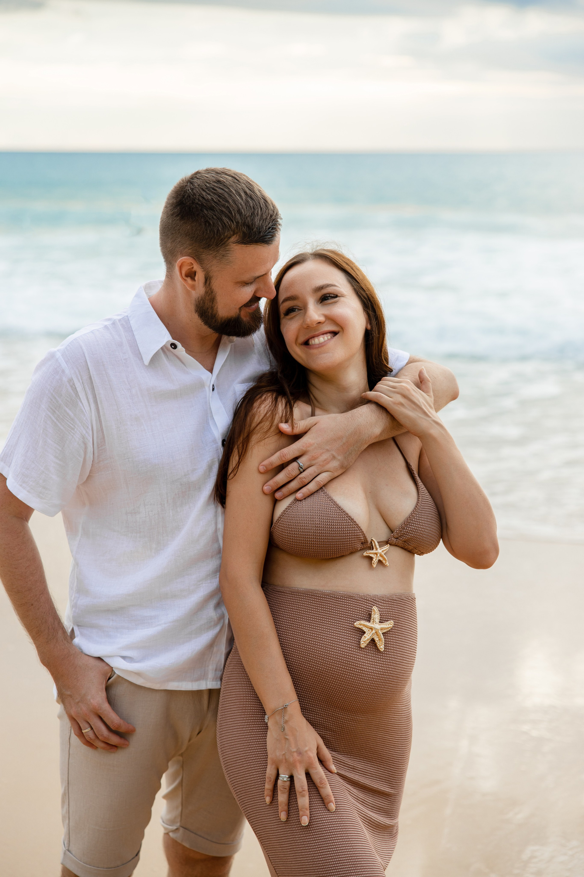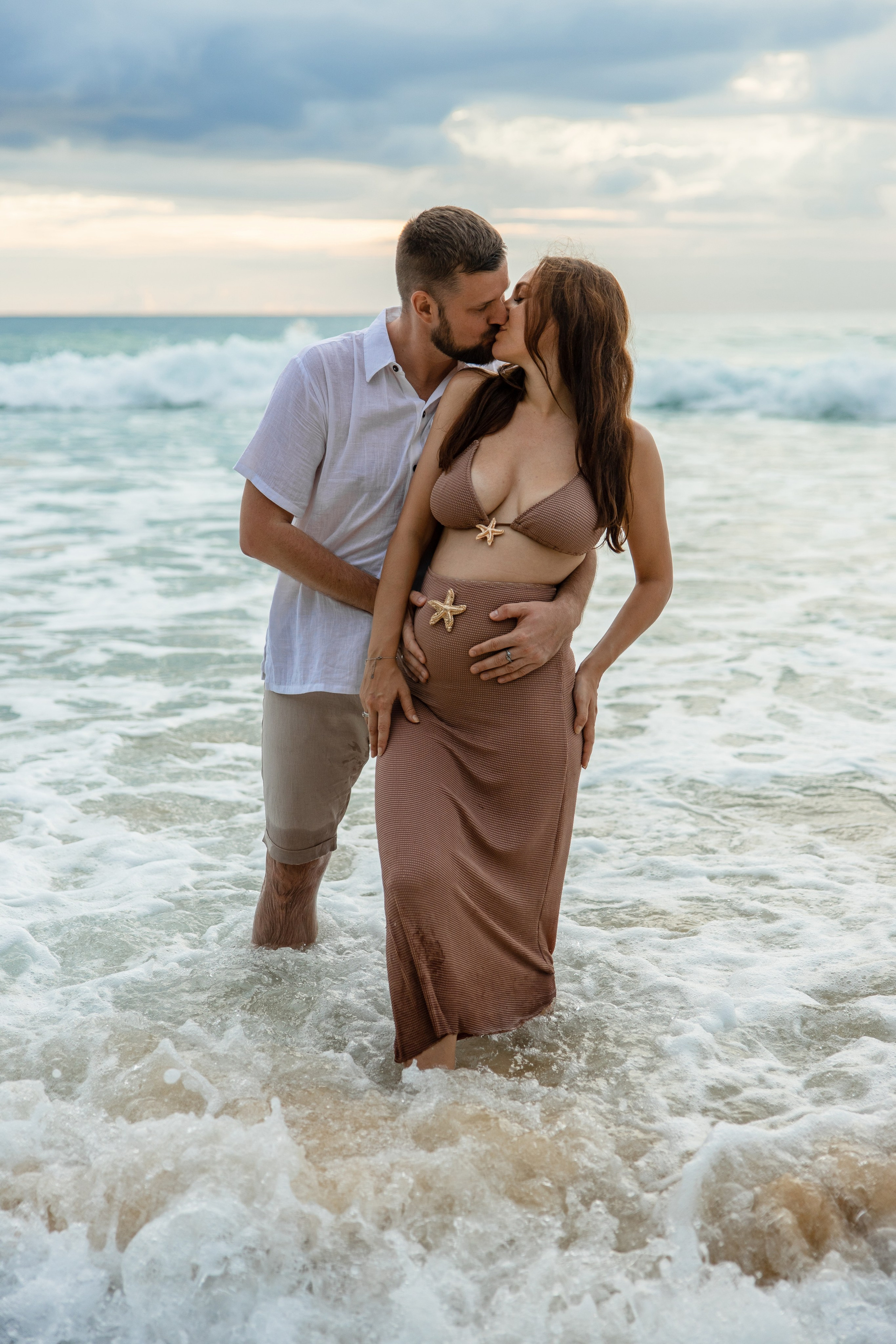 Во время этой съёмки мы уловили настоящие эмоции пары — нежность, заботу и гармонию. Естественный свет, спокойная морская волна и золотое свечение заката сделали фотографии тёплыми и живыми.
